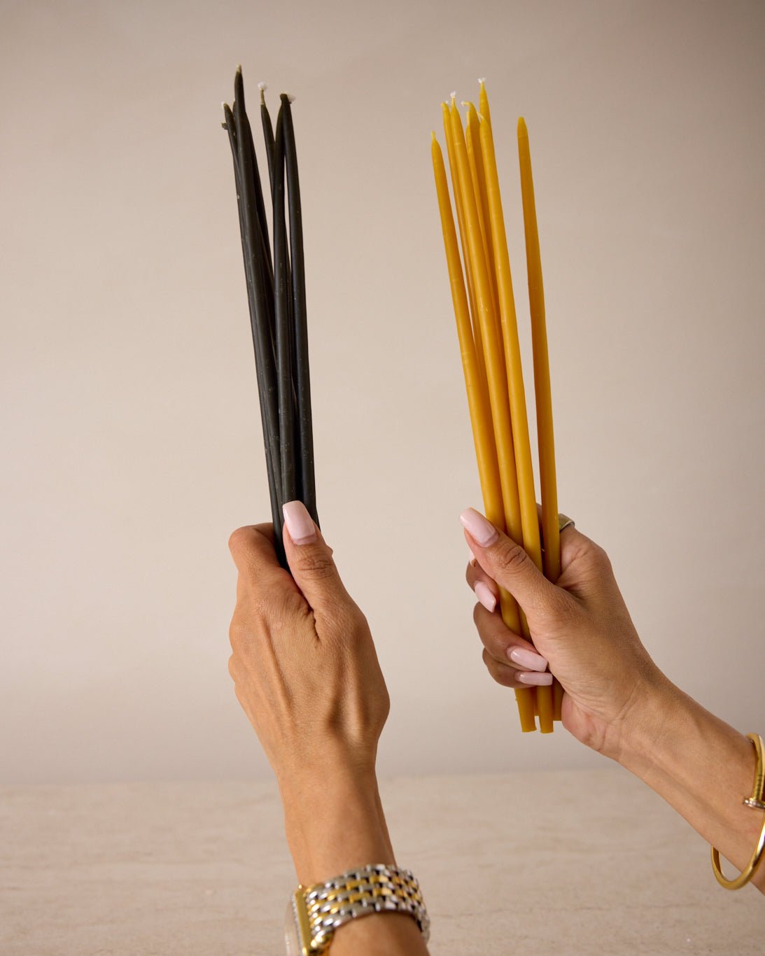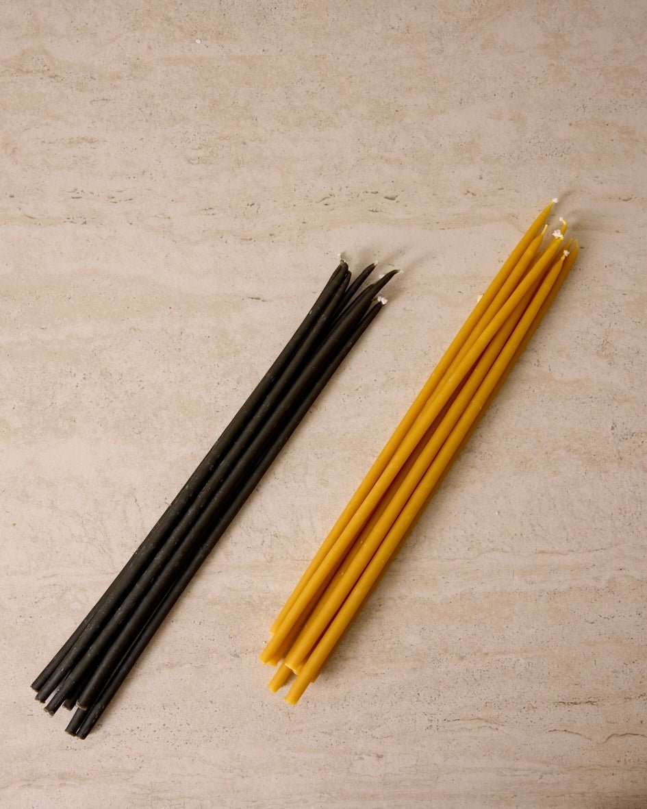 Our 100% Natural Beeswax Taper Candles add elegance to any table setting. The slender 12-inch profile and graceful silhouette create vertical interest that draws the eye across your dining space. These premium beeswax candles work beautifully as centerpiece elements or elegant accents on side tables, bringing sophisticated ambiance to your home. Complete set of 10 candles. Available in natural and black finishes.