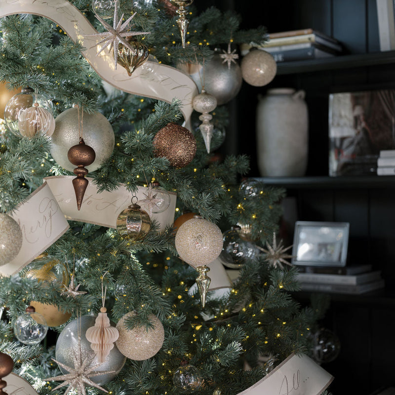 Timeless elegance for your holiday tree. Elevate your seasonal décor with our Handcrafted Antique Bronze Beaded Glass Ornaments. Each ornament is mouthblown and artisan-crafted, featuring a stunning antique bronze beaded mercury finish that shimmers beautifully under holiday lights.