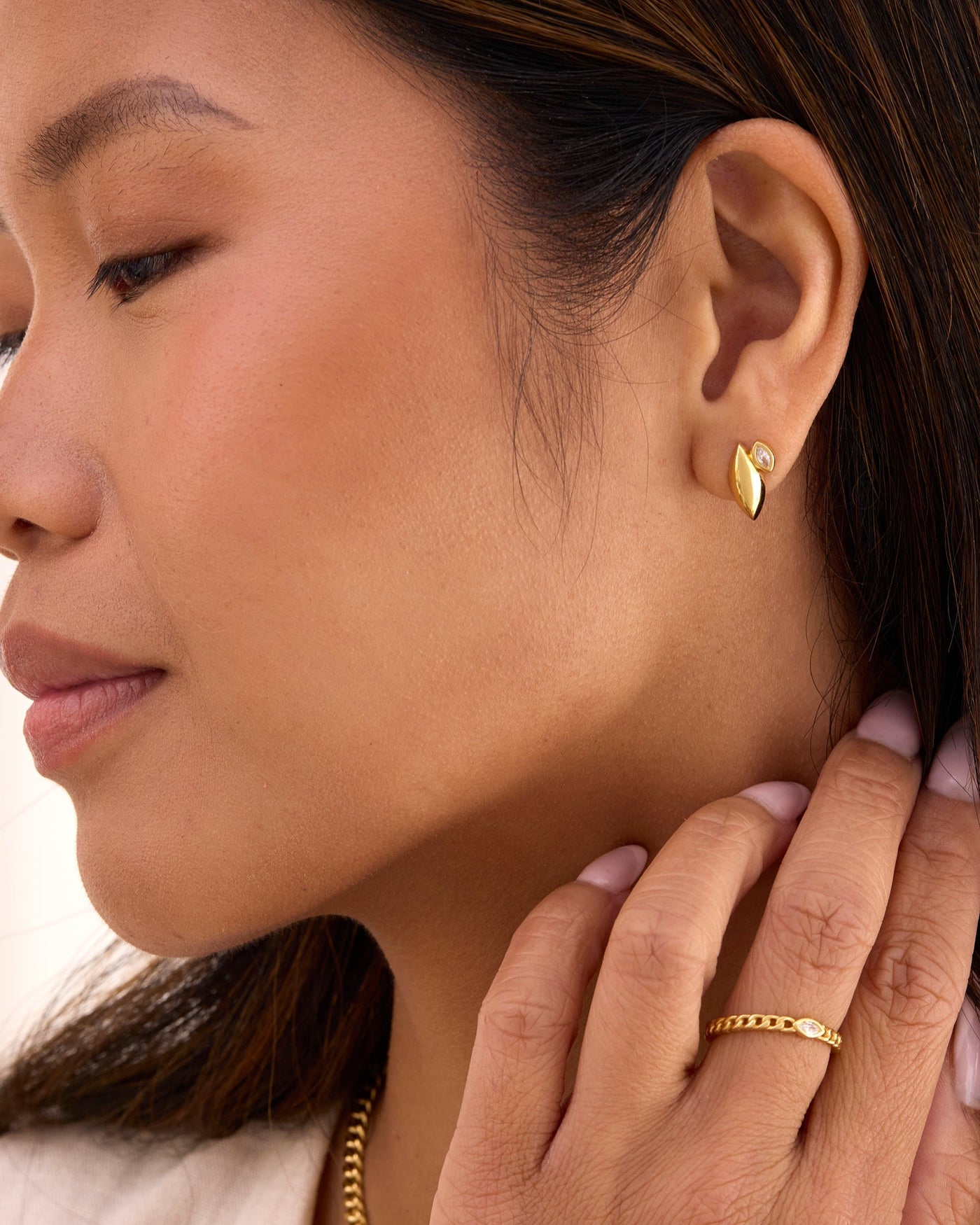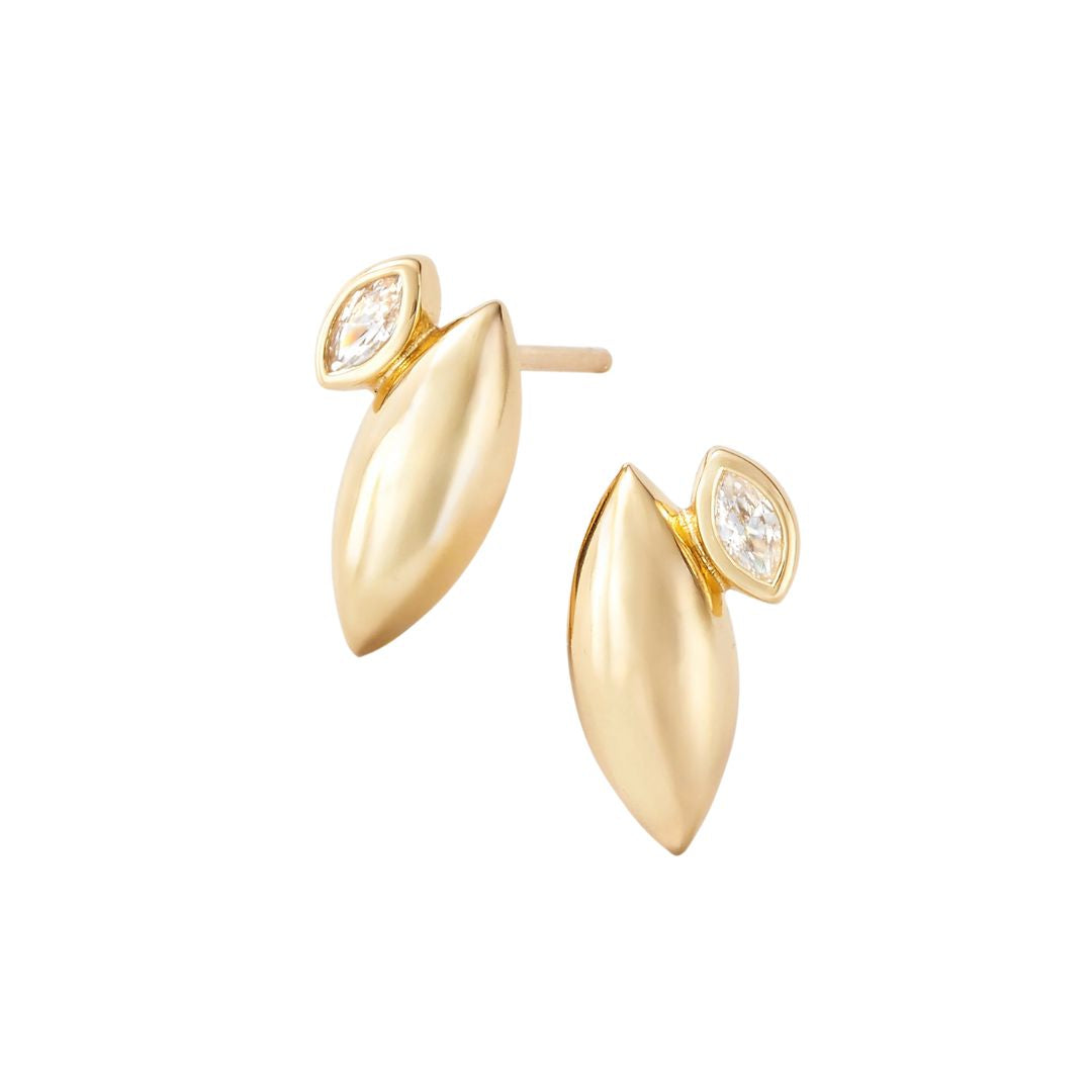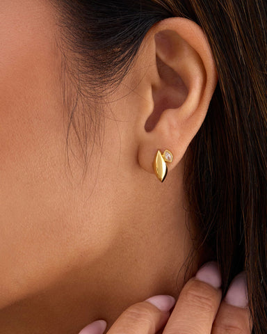 Softly sculptural with a hint of unexpected sparkle, the Azalea Gold Stud Earrings bring the beauty of a bloom captured mid-unfurl. A graceful gold petal forms the base, while a single off-center white topaz creates a touch of asymmetry—subtle enough for everyday, yet striking enough to feel like two earrings in one. The result is a modern floral silhouette that feels refined, artistic, and effortlessly feminine.