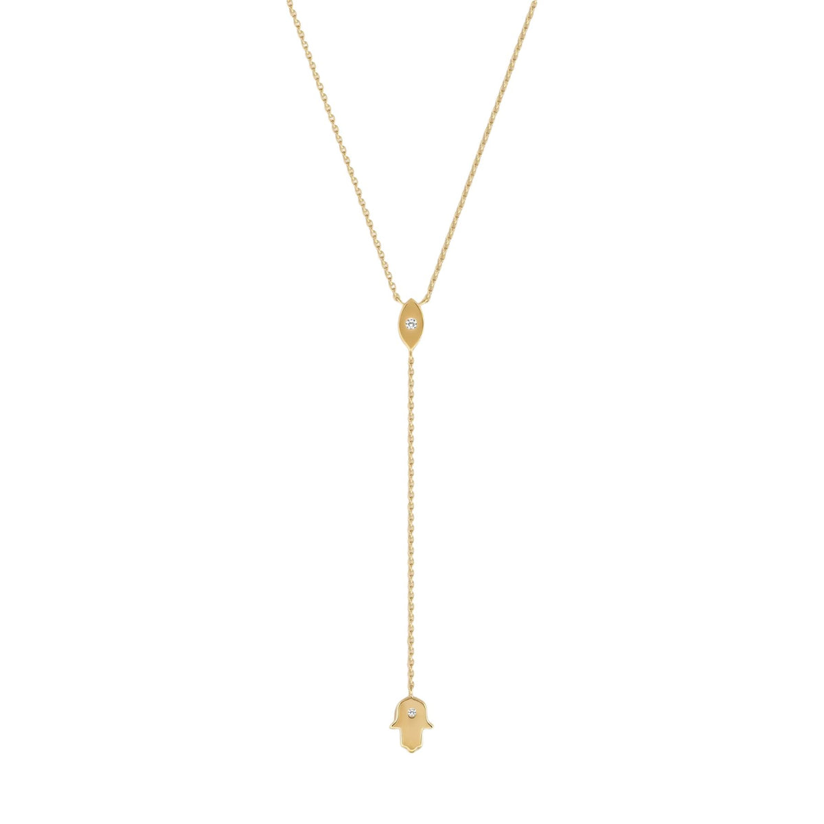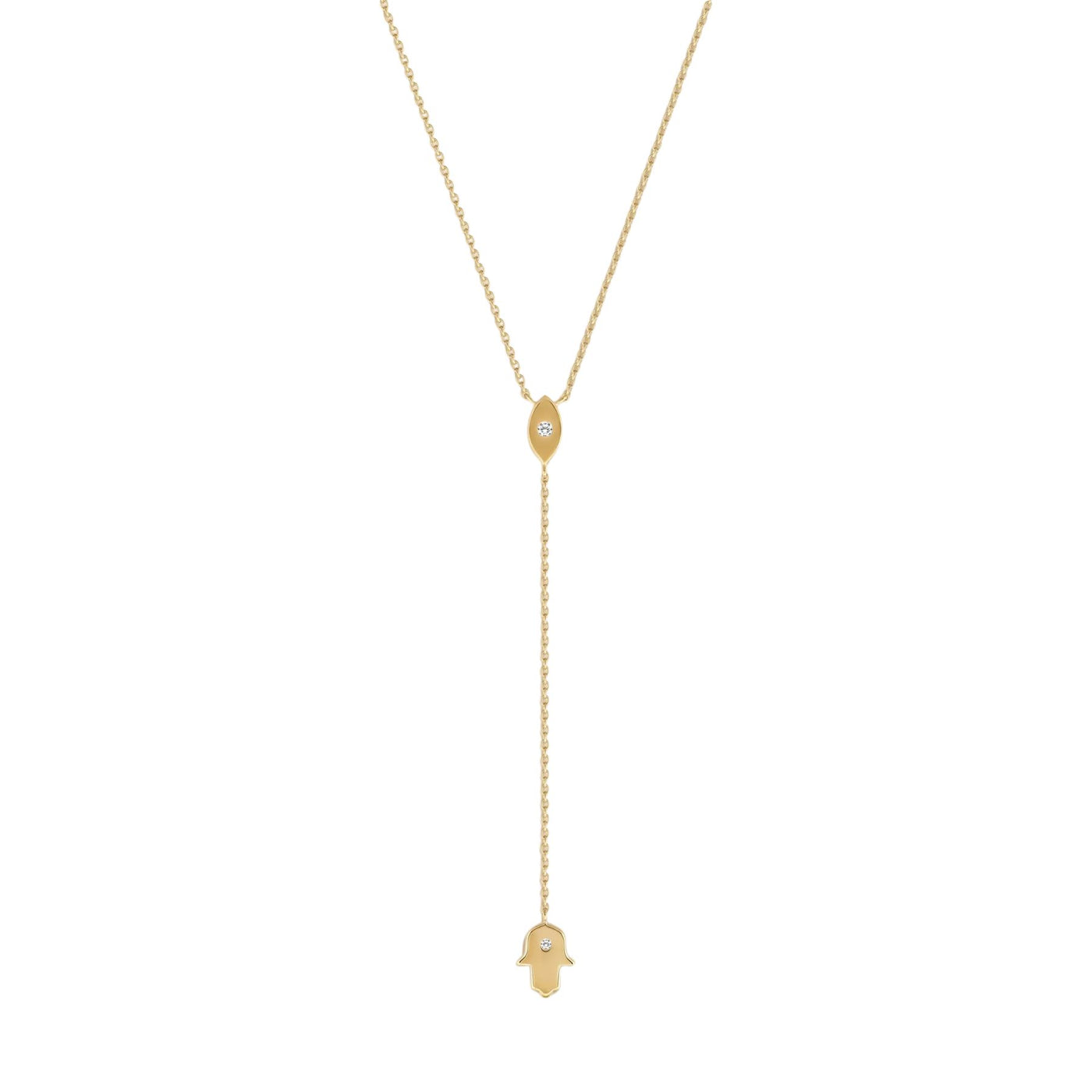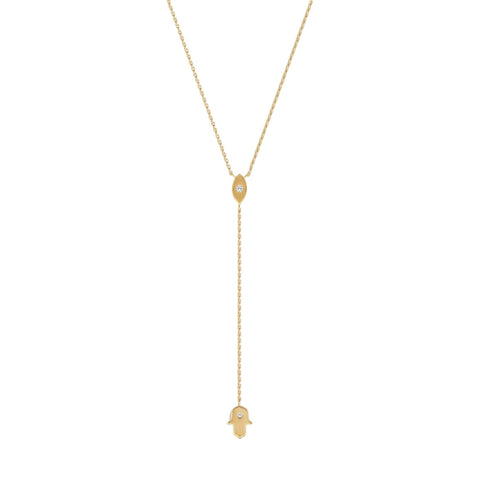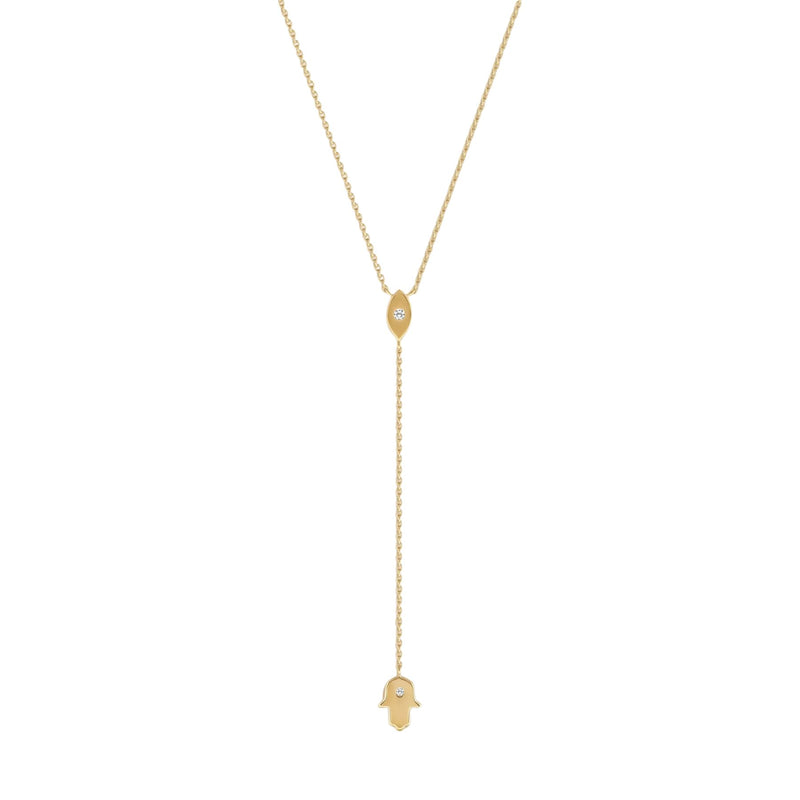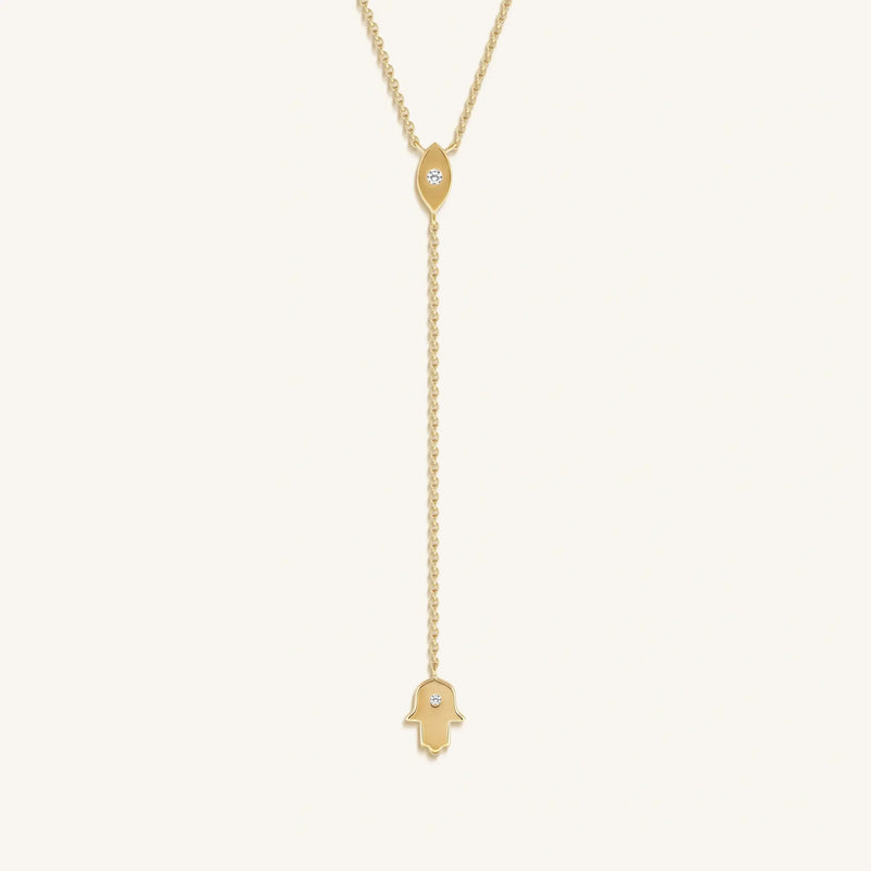 Embody protection, peace, and intuition with the Gracious Guardian Gold Evil Eye & Hamsa Necklace. Crafted in radiant 18K gold-plated silver, this lariat-style design unites two sacred symbols—each bringing timeless meaning and modern elegance.