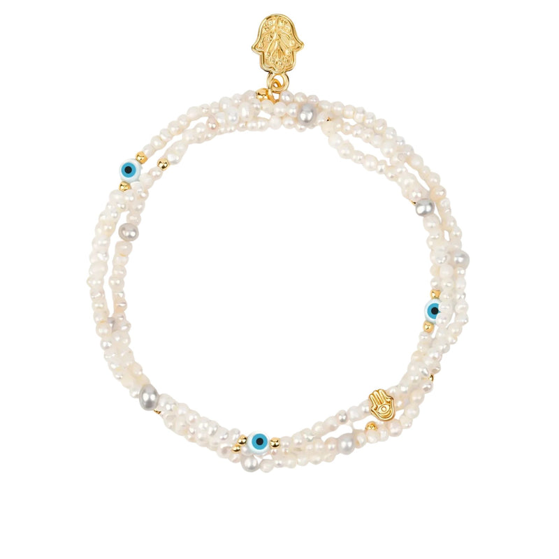 Known as the June birthstone, Pearls symbolize transformation and serenity, soothing the spirit while uplifting the heart. Paired with the Evil Eye’s watchful protection and the Hamsa Hand’s grounding stability, this meaningful piece is designed to keep your aura aligned and your energy shielded.