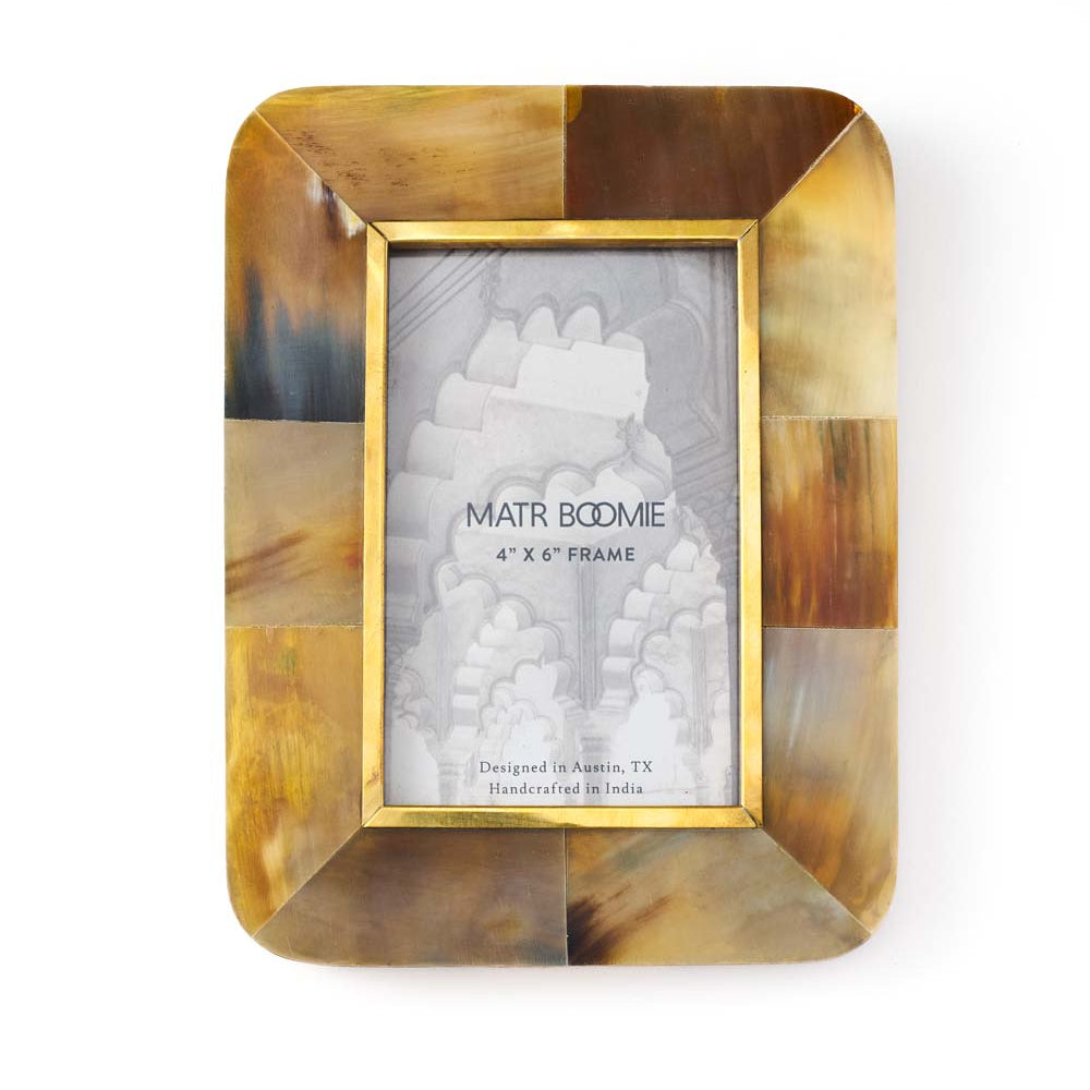 Bring warmth and artisan craftsmanship into your home with the Kachhua 4×6 Rounded Picture Frame. This elegant frame is handcrafted from cruelty-free horn and features a refined brass inlay that enhances its natural tan and cream tones. The soft, rounded edges and smooth polish highlight the organic variations in the horn, giving each piece a one-of-a-kind character that feels both timeless and contemporary.