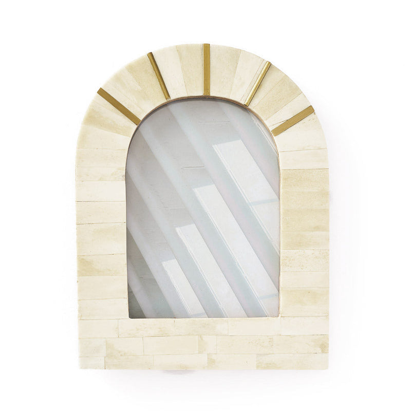 Graceful and timeless, the Mukhendu Arch 5×7 Cream Picture Frame brings a touch of architectural beauty to your home. Inspired by the soft curves of traditional archways, this handcrafted frame is made from ethically sourced, cruelty-free bone tiles and delicately accented with brass inlay. The smooth cream tones and luminous brass detailing create a serene balance between texture and refinement.