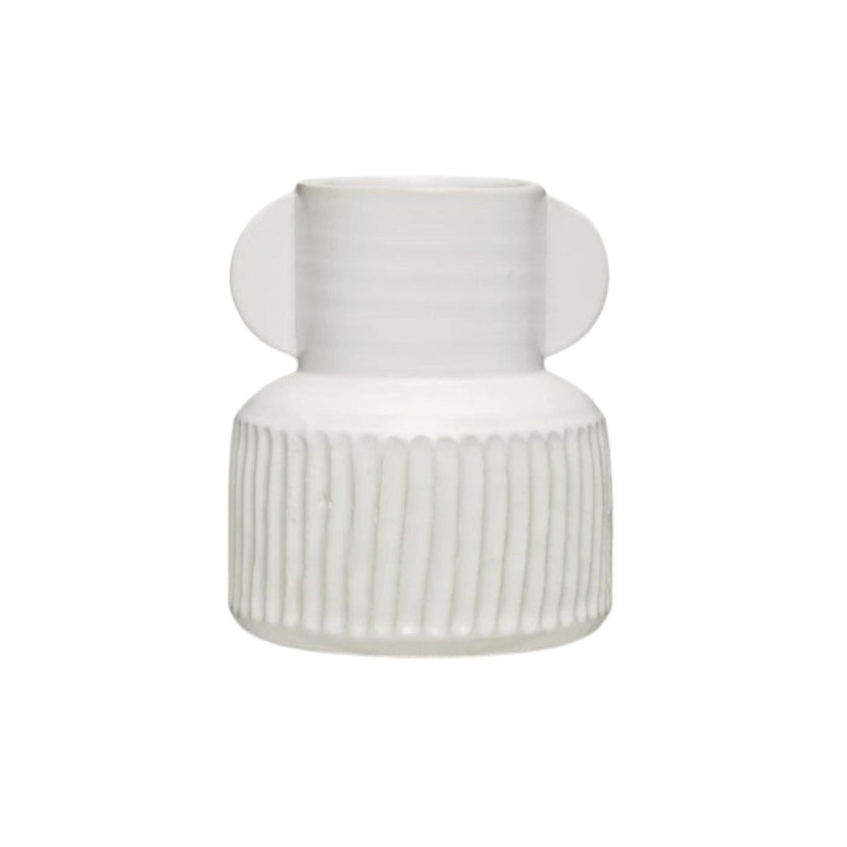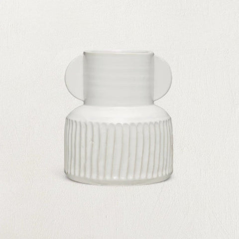 Bring timeless elegance to your space with the Stoneware Pleated Vase. Featuring a clean white glaze finish, this vase is accented with vertical handles and pleated grooves that add subtle texture and artisanal charm.